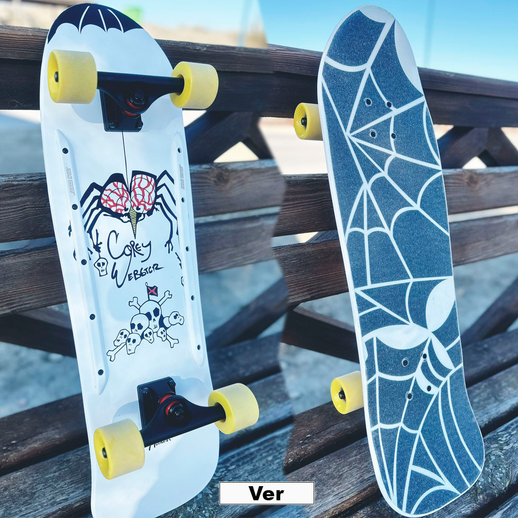 Thrashin' es un ícono de la cultura del skate. El skate de Corey Webster lleva en el gráfico la esencia y la energía de los años 80 en el mundo del skateboarding. Las calaveras representan el peligro Y adrenalina, Las arañas simbolizan la conexión con la comunidad skater y los huesos simbolizan la resiliencia y las caídas.